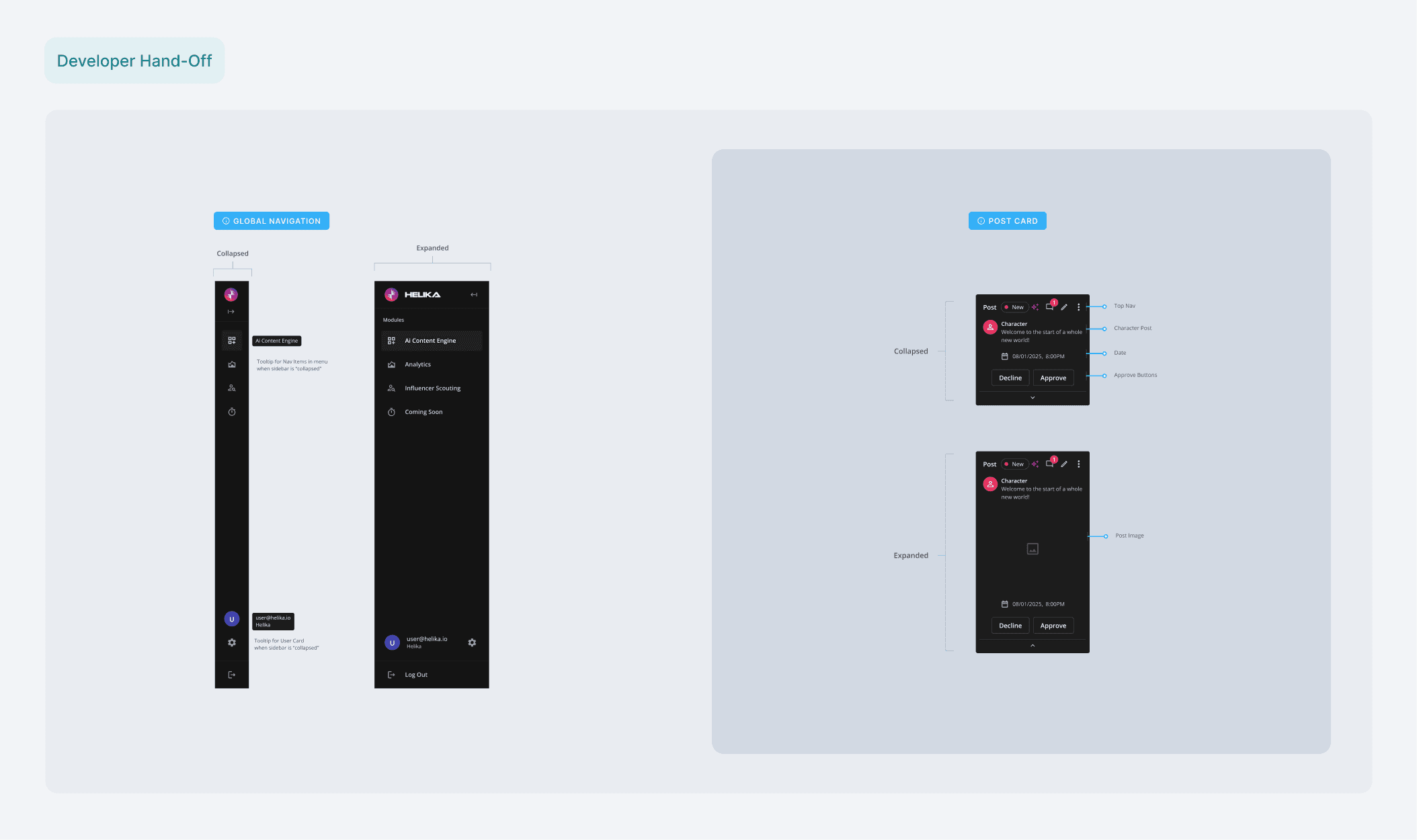 The Figma developer hand-off file included clear guidelines and documentation with annotations, as well as component properties set up. Any subatomic details of components (e.g. spacing, colors, fonts, etc.) where defined through values and tokens stored in variables from the design system.