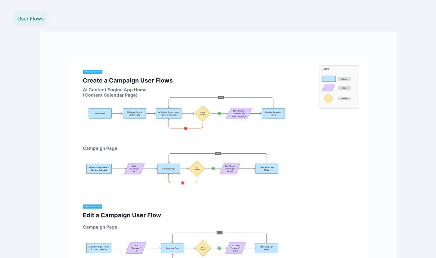 After testing the POC and receiving feedback from users, we brainstormed a new plan for the integration of multiple applications in a cohesive platform for the MVP. I created a Home screen hub that would host multiple modules — the AI Content Engine being one of them.