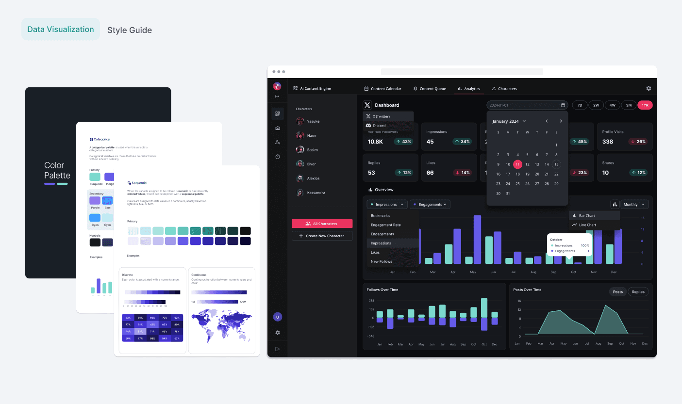 Following app integrations there was a user need to display analytics utilizing social media APIs. The analytics components and flow had to feel familiar with each platform while appearing homogenous in one dashboard. Following UI best practices for data visualization, I created a style guide with a focus on accessiblity.