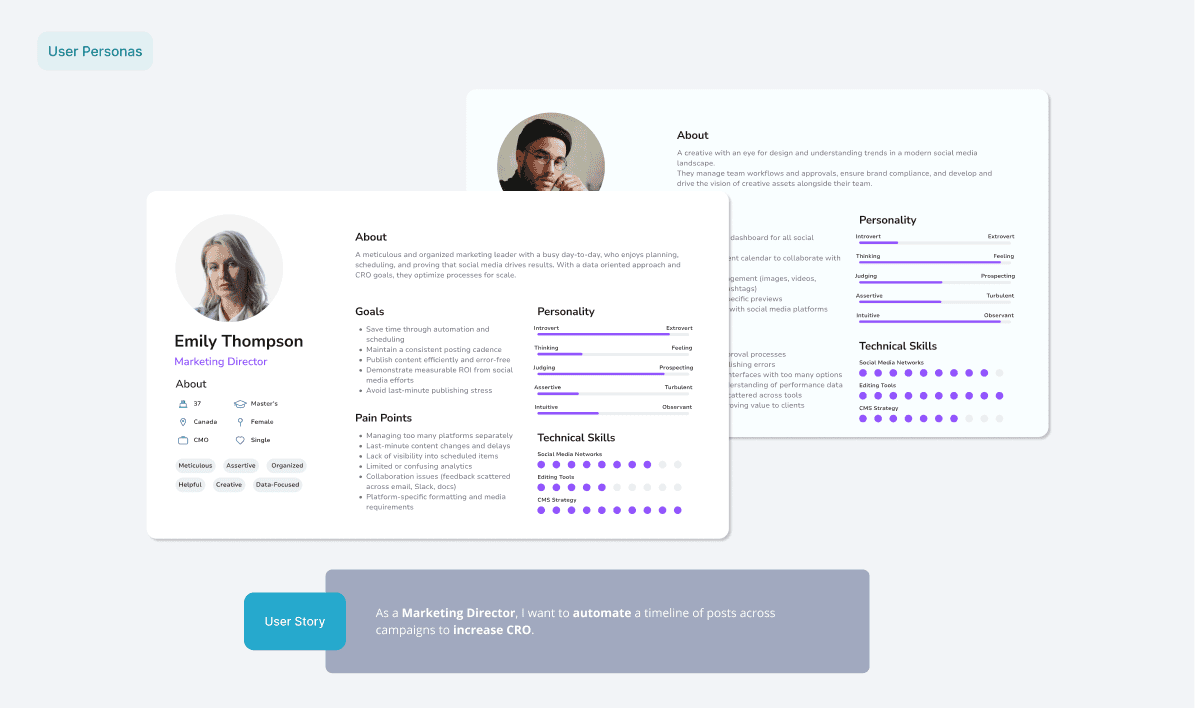 During the Empathize and Define phases of the Design Thinking methodology, we identified personas and user stories based on interviews with users from partnered studios, highlighting their needs and pain points. Studios need an innovative way to connect with their game's community and utilizing IP characters the audience is familiar with alongside social media automation would cover that gap in the market.