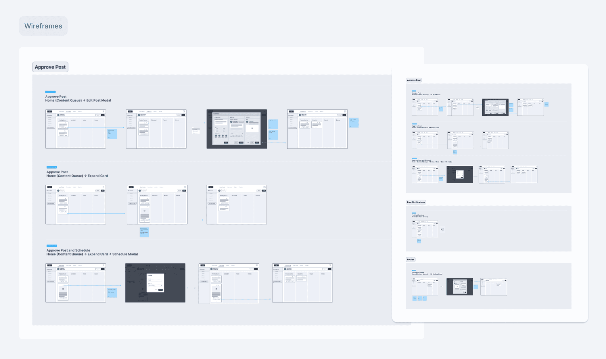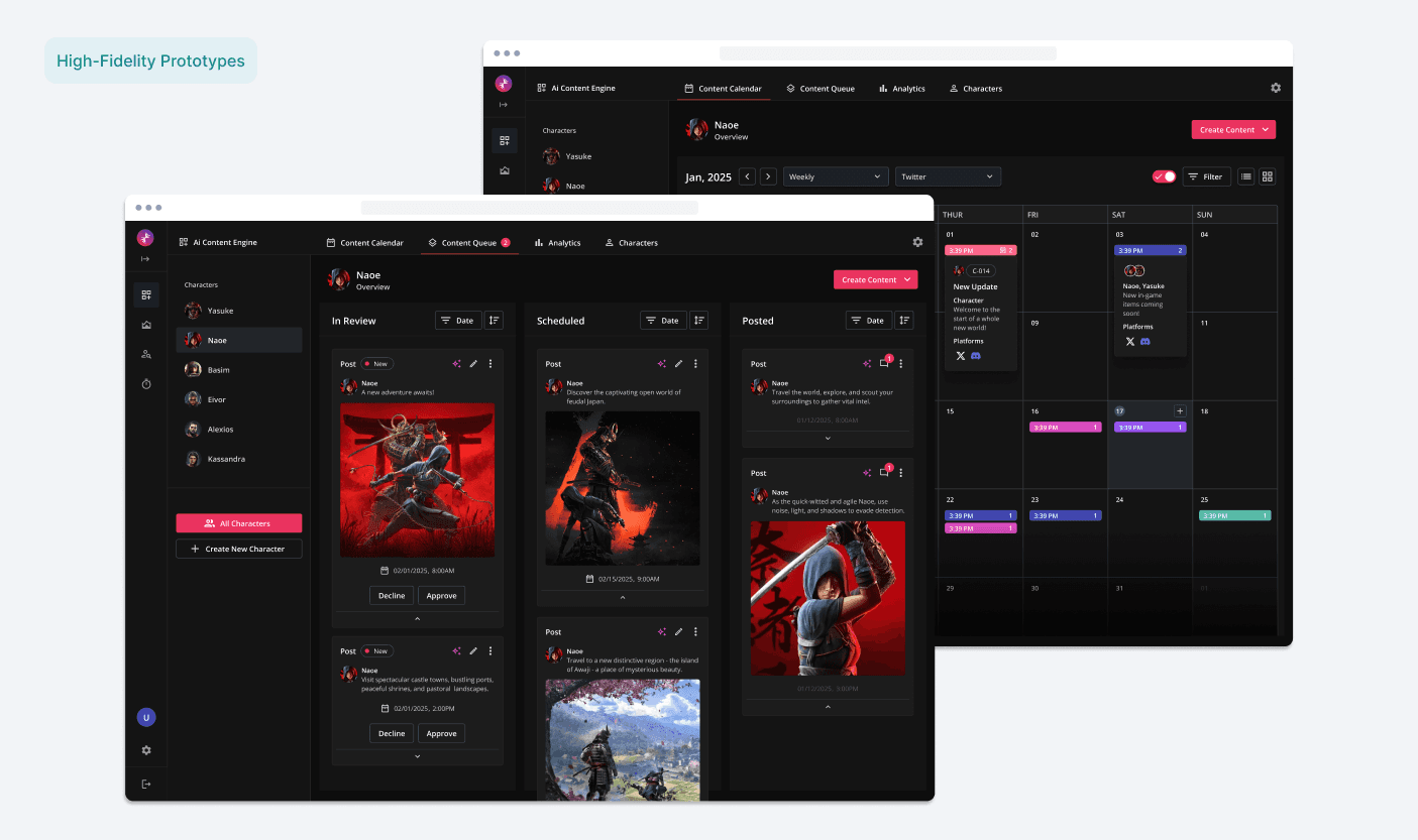 The feasible requirements from the BRD for the POC were a happy path with main user flows such as sign up, onboarding, character settings, main hub (content calendar), and a social media post management feed.