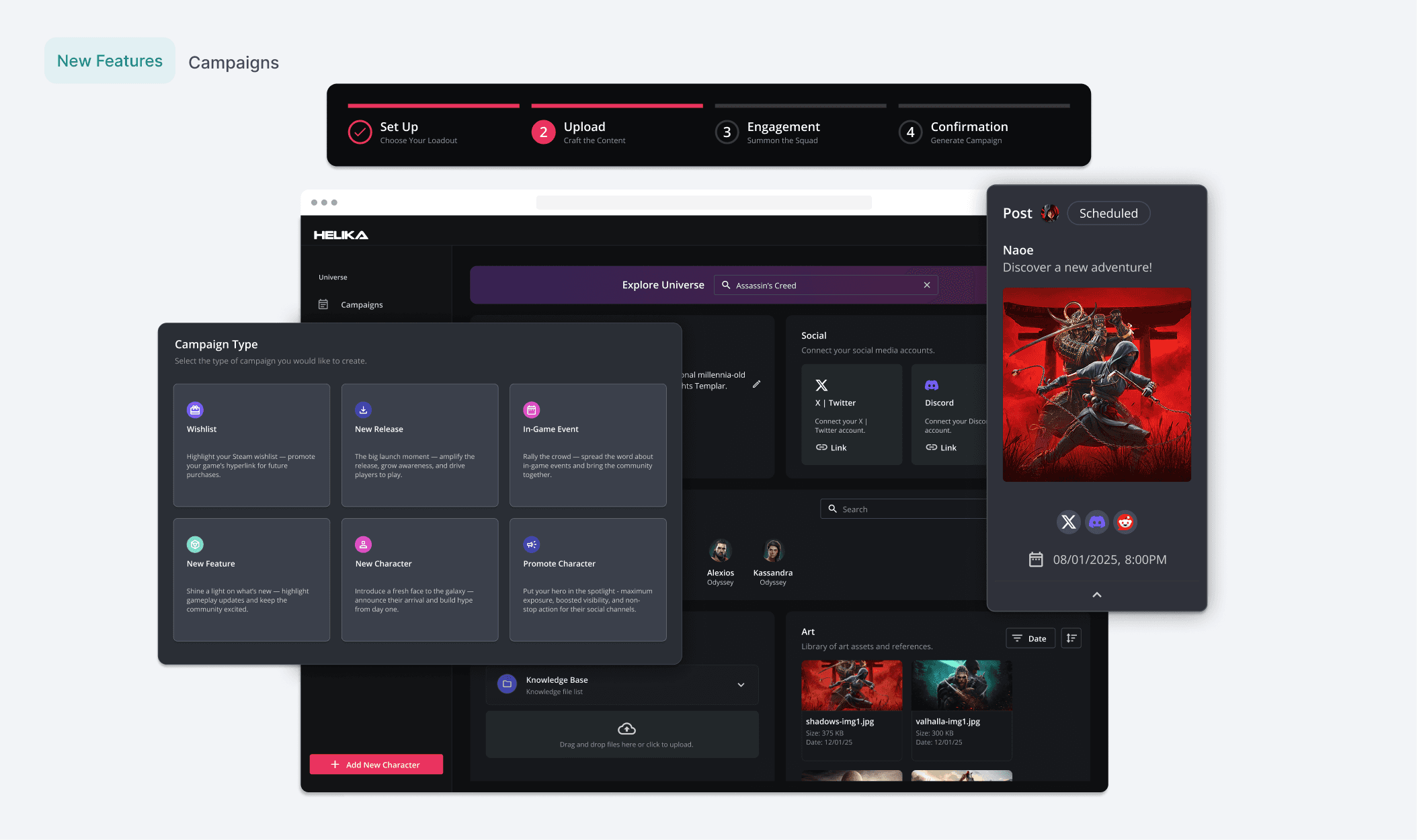 Taking into account the system hierarchy, I designed a new campaign creation flow, where users could create multiple social media posts through a scheduled campaign. Insights from user feedback regarding campaign creation revealed that users where overwhelmed with multiple settings in one page. I created a new version of the flow with a stepper and starter campaign templates that broke down the process into shorter and simpler steps for a more clear user experience.