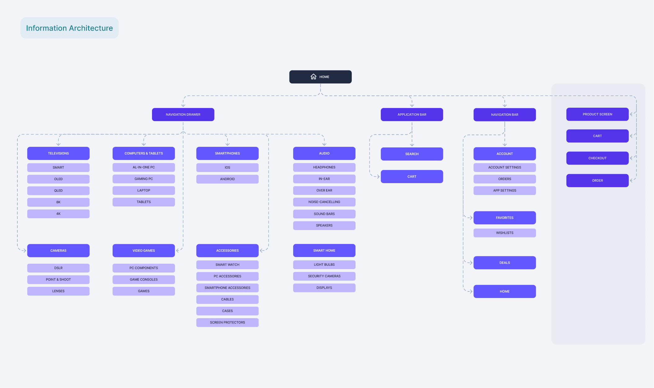 The information architecture which illustrates the menu items in the navigation drawer, navigation bar, and application bar throughout the app.