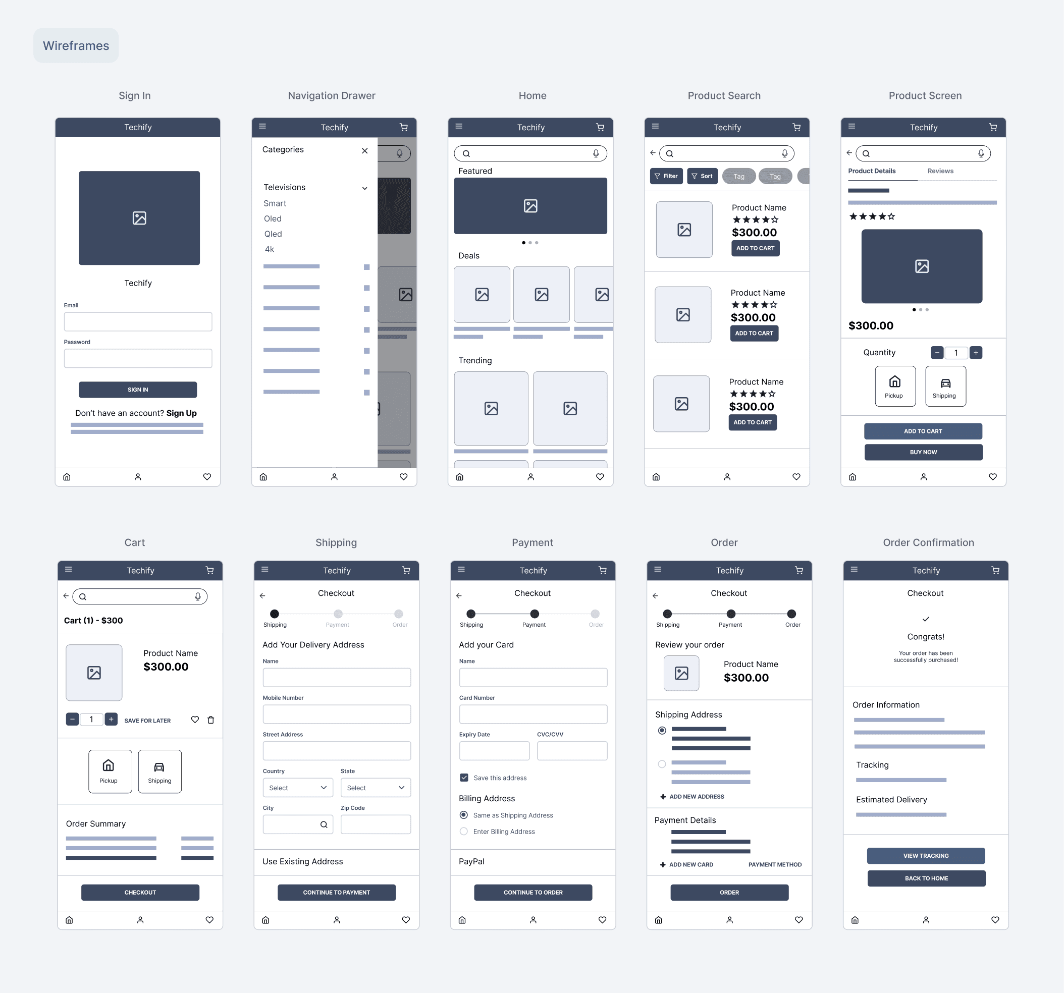 First version of the core navigation, including the Home, Product Search, and Product screens, as well as a navigation drawer with product menu items and filter and sort functionalities to aid in the product search.