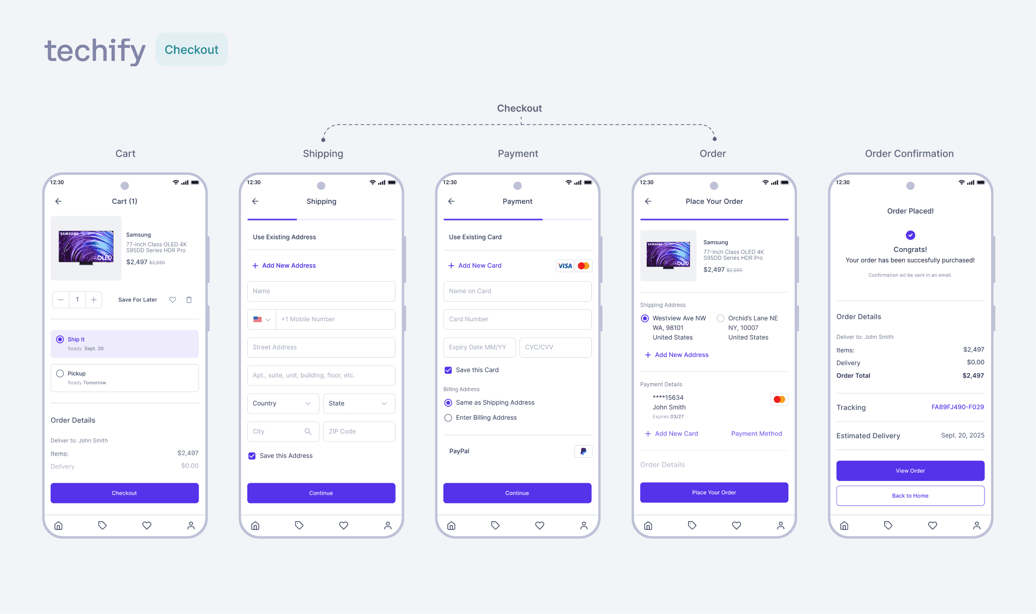 The checkout process had to be intuitive, and based on my studies of various competitor app user flows, native apps break the process into steppers instead of one scrollable page. The user knows exactly which part of the process they are in, and with side swipe gestures or the press of a button, they can continue their journey.