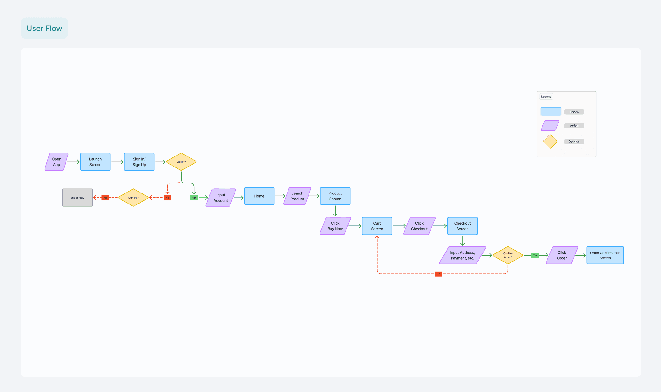 Building upon those insights, I developed a happy path user flow to define the preliminary information architecture ideation. With the structure established, I conceptualized wireframes in Figma of the main screens in the user flow.
