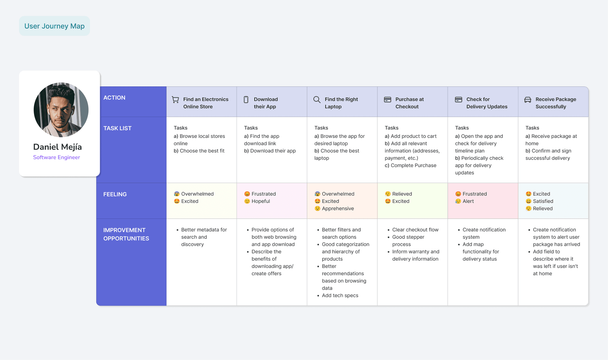 • A lack of online tech stores with outdated inventory and few tech specifications detailed. • Complicated tech support contact and delivery status updates.