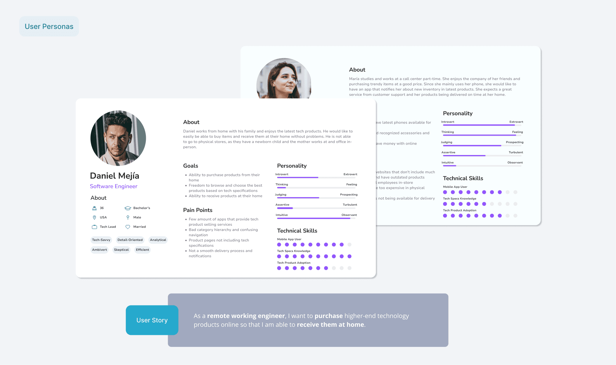 The user personas which informed the app ideation process defining ther goals and pain points, as well as their personality and traits.
