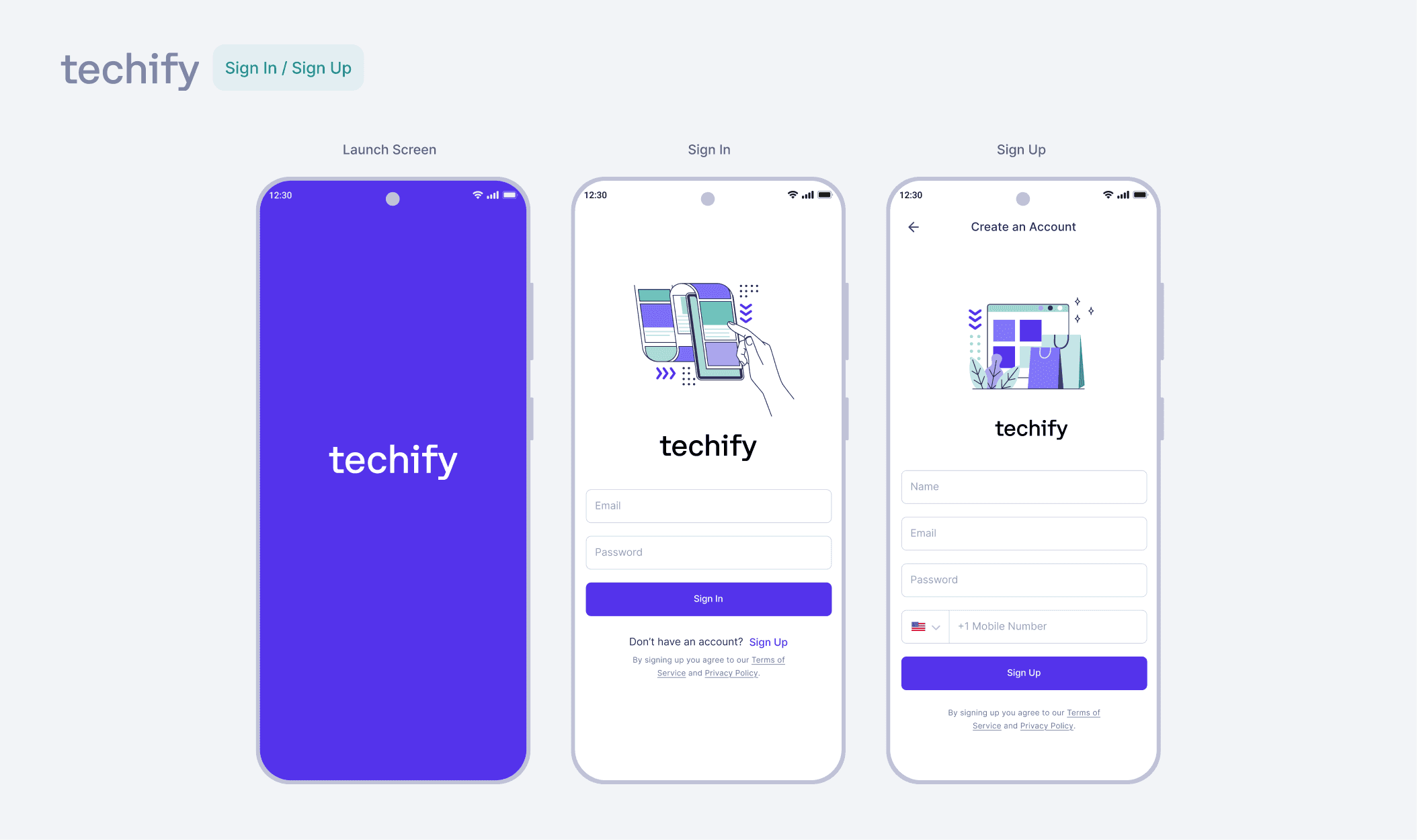 The Launch and Sign In/Sign Up screens which contain their labels as placeholder in their input components, a modern stylization for native apps. The button differs from the wireframes and is taller in size, as a good UX practice is to have a minimum of 44px height to allow a digit to be able to tap it.